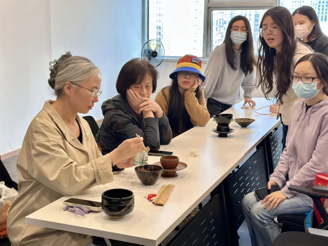 听过了老师讲解,就到了实践体验环节。点茶使用碾细的茶末,会将茶的香气和苦涩同步放大,因此老师选取了口味最清淡的白茶让大家尝试。老师细致传授点茶技巧,大家一手扶住茶碗,一手用茶筅快速击拂茶汤,茶粉与茶汤混合乳化表面浮现出泡沫。经过反复击打与多次添水,泡沫逐渐变得细腻洁白,正如宋代知名文人黄庭坚所描绘的“金瓯雪浪翻”。一碗融合了宋代传统与近代考据的特色点茶就制作完成了。大家分而食之,清甜的茶汤融合细腻丝滑的口感,带来一种别样的“吃茶”体验。