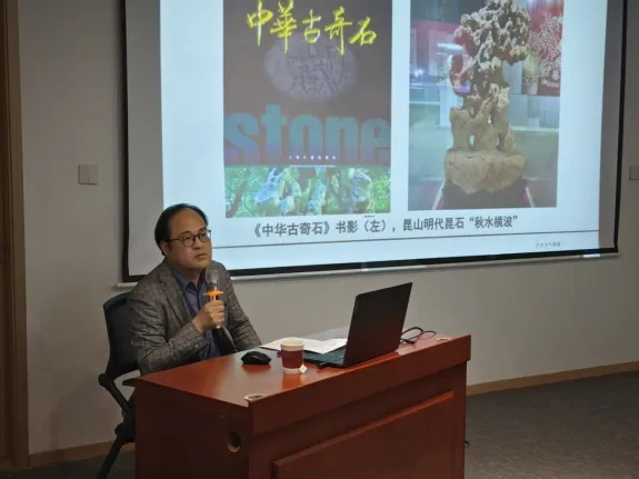 讲座现场,俞老师先带读者系统梳理了赏石艺术的发展脉络:赏石艺术成熟于唐宋、完善于明清、蓬勃发展于当代,是中华传统文化中独具韵味的艺术瑰宝。